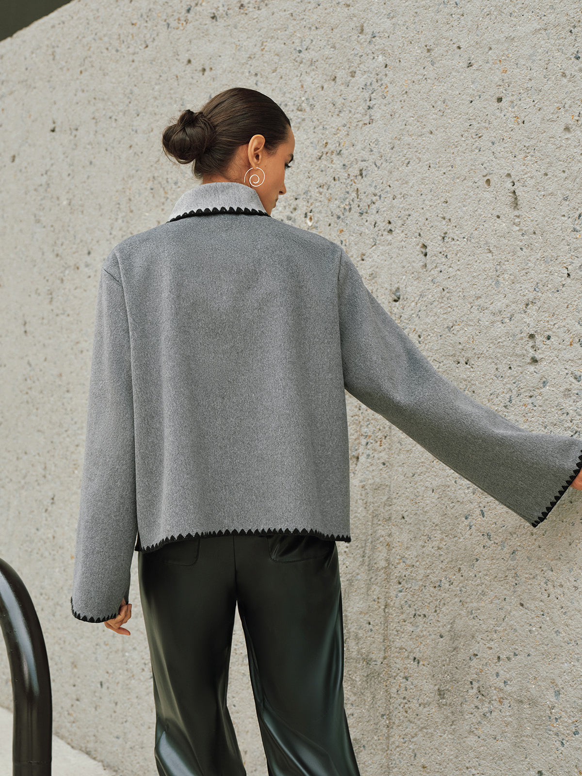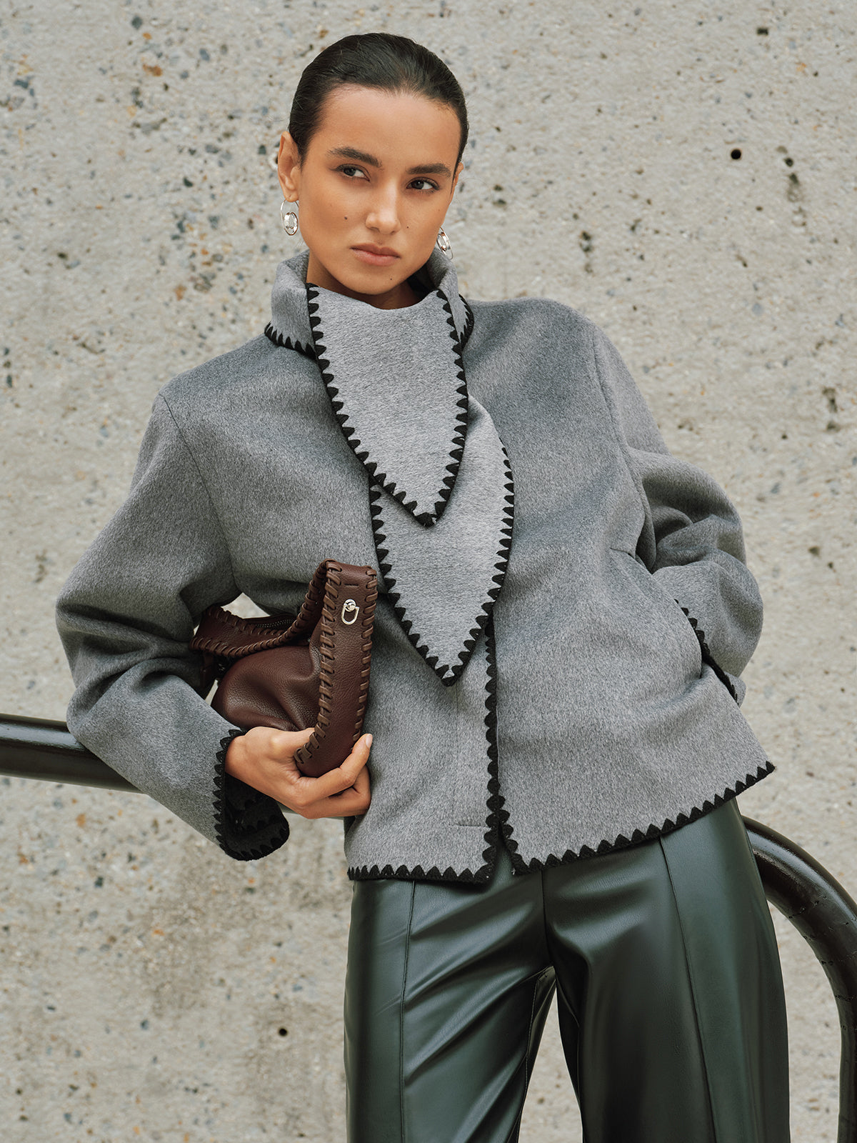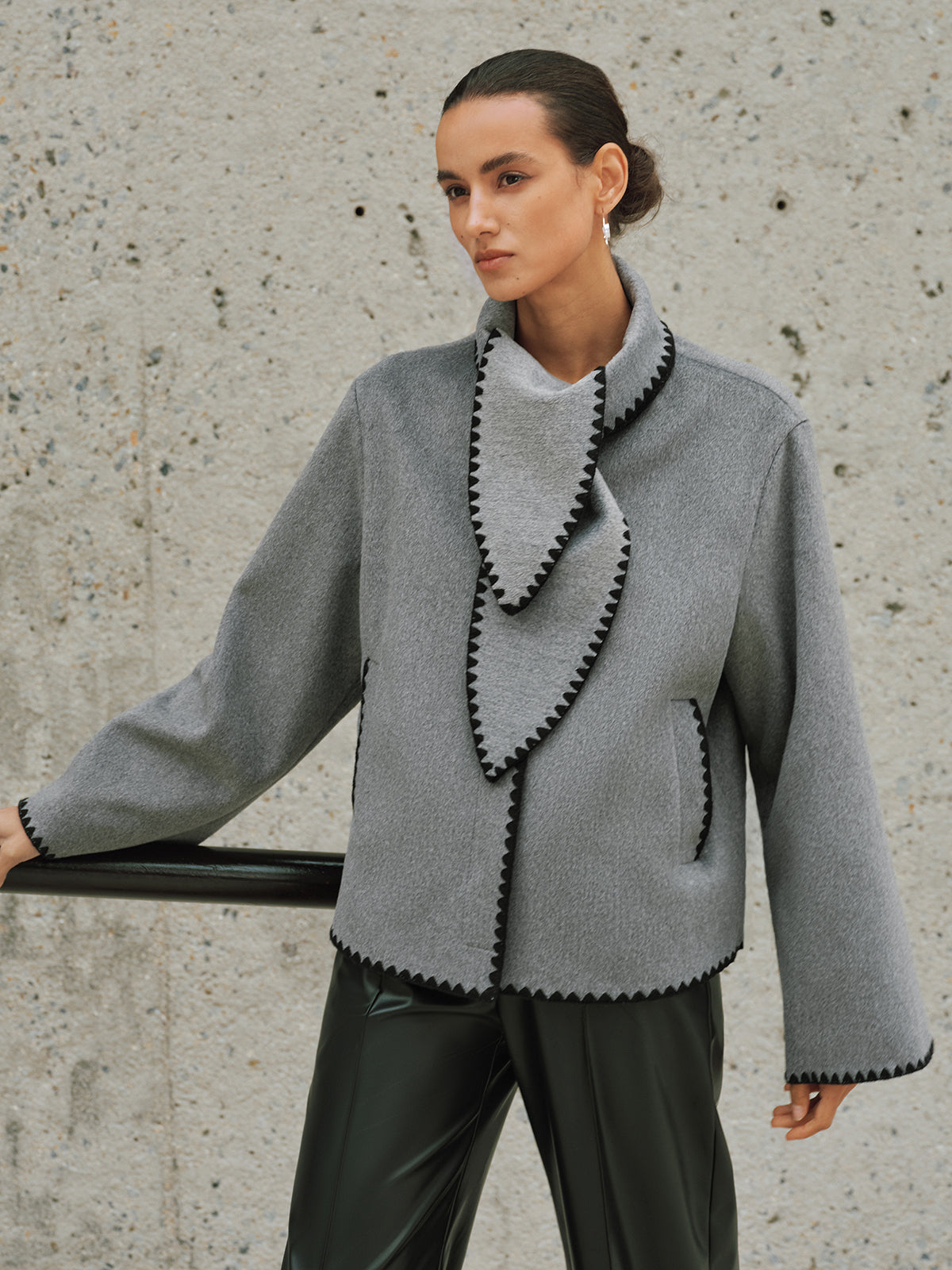 Tweed Contrast-Trim Knot-Collar Coat